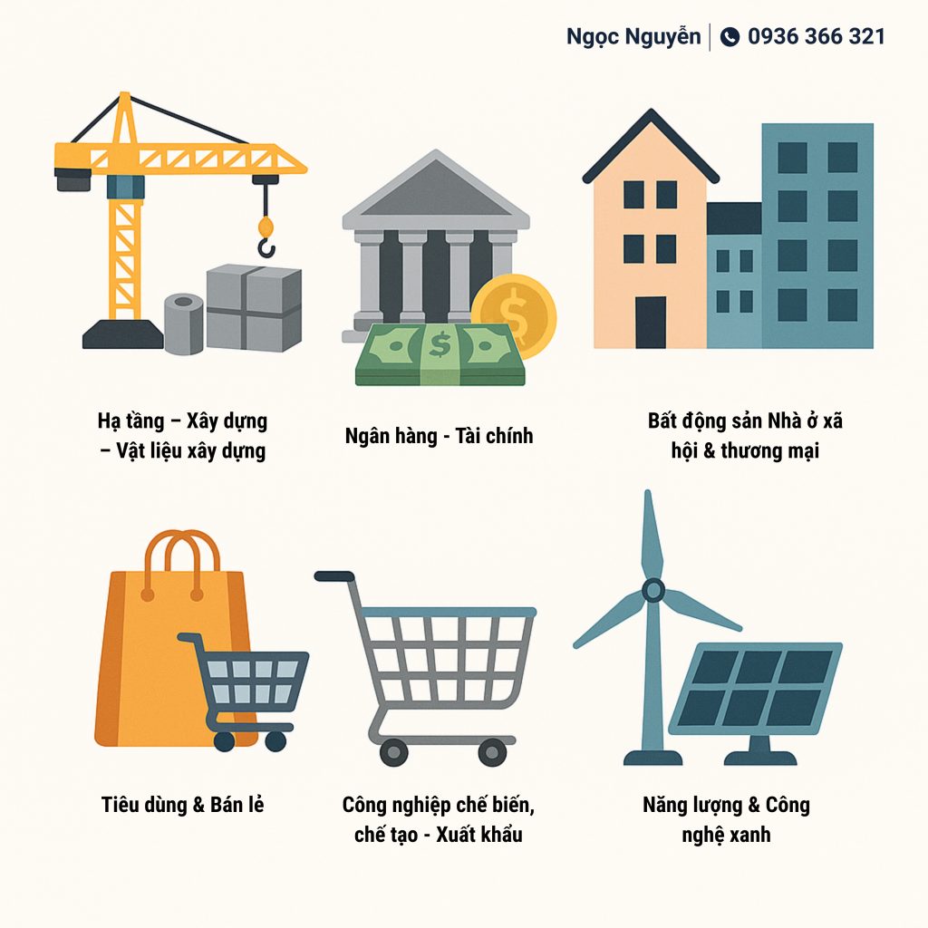 Cơ hội: Tăng trưởng tín dụng cao, NIM cải thiện nhờ lãi suất huy động thấp, nợ xấu được kiểm soát. Các ngân hàng có tỷ trọng cho vay sản xuất kinh doanh, bán lẻ (TCB, MBB, VCB, ACB) sẽ hưởng lợi.